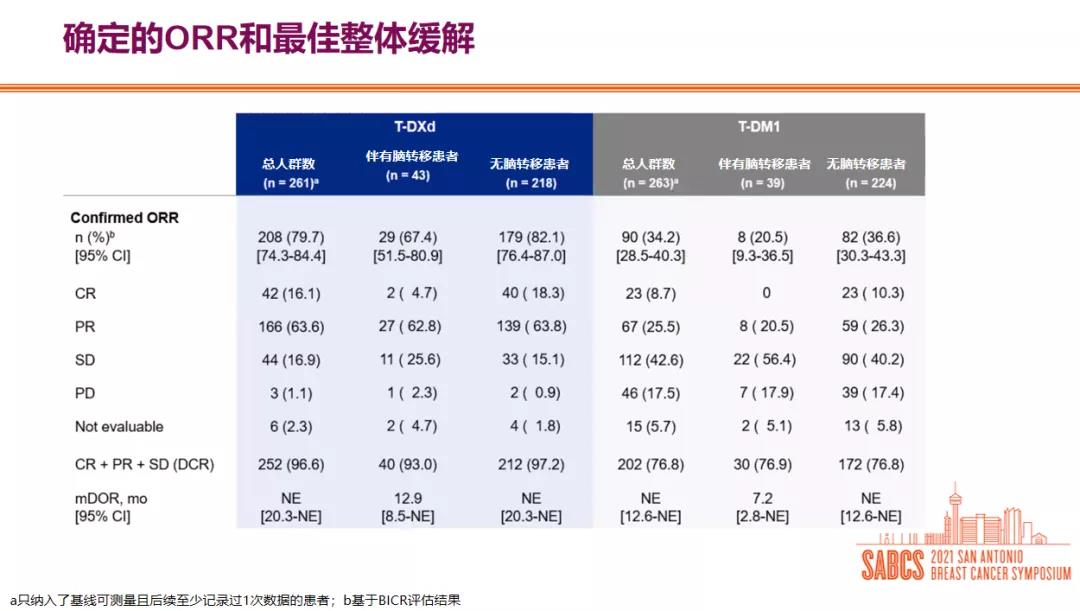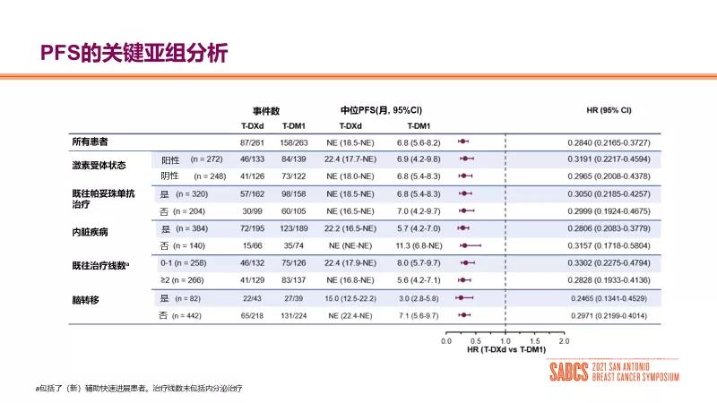 2021 SABCS大会上,DESTINY-Breast03研究亚组分析结果进行了更新,总人群数据与各亚组相对获益趋势与既往一致:BICR评估的总人群mPFS HR=0.28(P=7.8×10-22);T-DXd组和T-DM1组的确认的客观缓解率(ORR)分别为79.7%和34.2%,亚组获益趋势不受激素受体状态、既往帕妥珠单抗治疗、内脏疾病、治疗线数和脑转移状态等的影响。