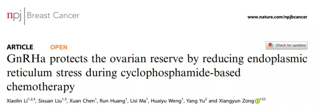 [2]Li X, Liu S, Chen X, et al. GnRHa protects the ovarian reserve by reducing endoplasmic reticulum stress during cyclophosphamide-based chemotherapy. NPJ Breast Cancer. 2021;7(1):132. Published 2021 Oct 7. doi:10.1038/s41523-021-00340-7