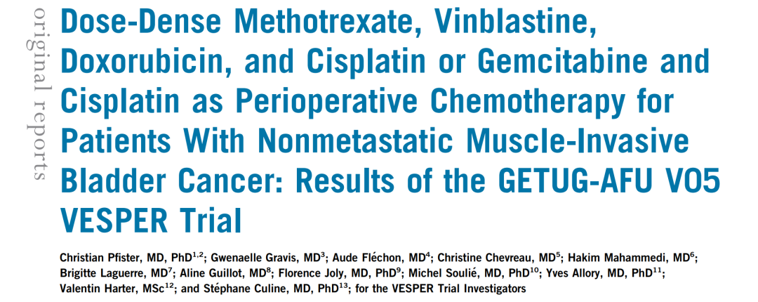 [4]Pfister C, Gravis G, Fléchon A, et al. Dose-Dense Methotrexate, Vinblastine, Doxorubicin, and Cisplatin or Gemcitabine and Cisplatin as Perioperative Chemotherapy for Patients With Nonmetastatic Muscle-Invasive Bladder Cancer: Results of the GETUG-AFU V05 VESPER Trial [published online ahead of print, 2022 Mar 7]. J Clin Oncol. 2022;JCO2102051. doi:10.1200/JCO.21.02051