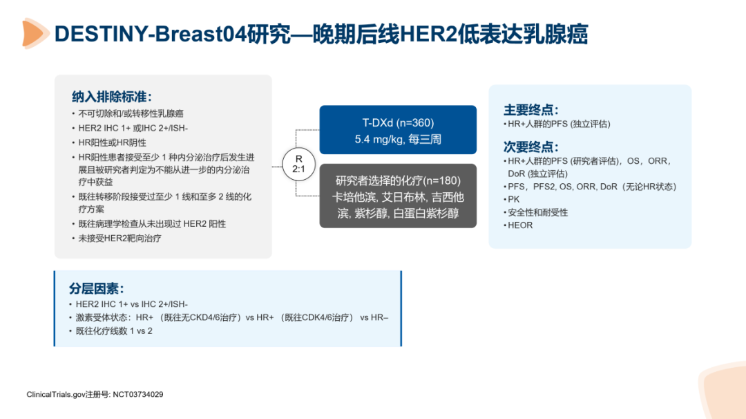 HER2低表达概念的提出源自T-DXd精准治疗的重要突破。I期DS8201-A-J101研究显示,对于HER2低表达晚期乳腺癌患者,中位既往治疗7.5线后,使用T-DXd可取得37.0%的客观缓解率(ORR)、中位无进展生存期(mPFS)达11.1个月,中位疾病控制时间(mDOR)10.4个月。在此基础上开展的III期研究DESTINY-Breast04、DESTINY-Breast06进一步探索HER2低表达晚期乳腺癌患者中T-DXd的疗效与安全性。2022年2月21日,DESTINY-Breast04试验重磅宣布达到主要研究终点,结果显示,与化疗方案相比,无论激素受体状态如何,T-DXd在PFS、OS方面均取得显著改善,续写HER2治疗的未来。