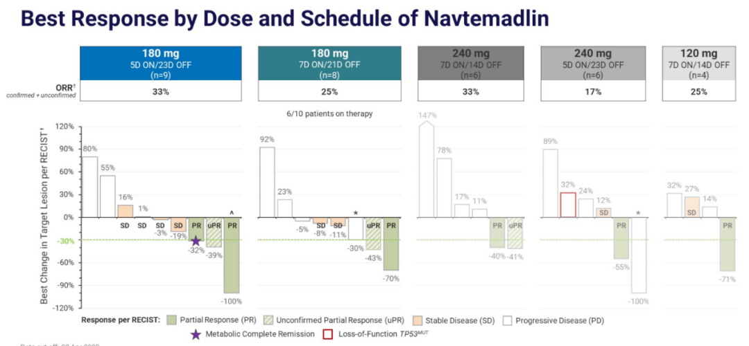 在该研究中,入组患者随机分配至5个剂量组:240mg 每日一次口服7天,停14天;240mg 每日一次口服5天,停23天;180mg 每日一次口服5天,停23天;180mg 每日一次口服7天,停21天;120mg 每日一次口服7天,停14天;直至疾病进展或发生不可耐受毒性。主要终点为II期推荐剂量和客观缓解率(ORR)。截至2021年11月30日,试验共入组31例受试者,中位年龄66岁,52%的患者存在内脏转移,71%的患者既往接受过2线以上的治疗。3/4级AE发生率为68%,最常见的为血液学相关不良事件:贫血32%、淋巴细胞减少32%、血小板减少19%。在剂量≤180 mg队列中,Navtemadlin耐受性良好,治疗时间较长,剂量下调发生率较低。180mg 每日一次口服5天,停23天剂量组可评估患者ORR 33%,确认的ORR 25%,DCR 63%。中位反应持续时间未达到(范围:6-16.2个月),中位起效时间4.1个月(范围:1.2-7个月)。其中一名应答者获得长期PR,治疗满2年时通过PET/CT确认CR。120mg组由于反应率低而关闭,最终选择180mg作为后续研究的推荐剂量。