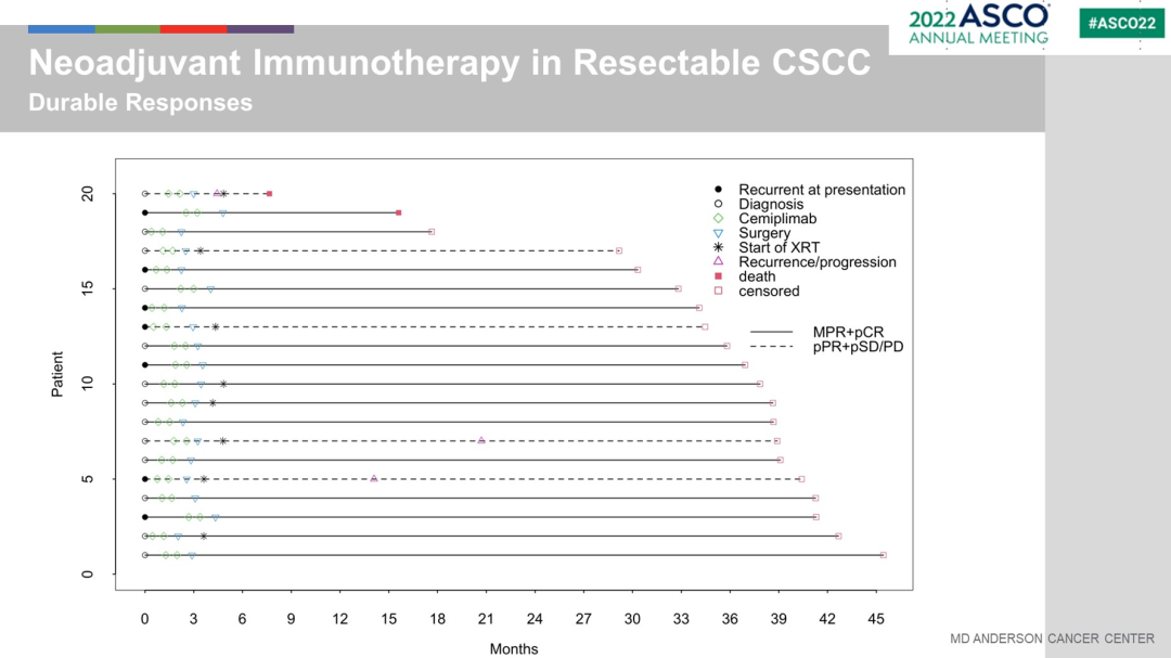 该研究显示可切除晚期头颈部皮肤麟状细胞癌患者对新辅助免疫治疗的病理反应持久。对于达到pCR的患者,辅助放疗可能是多余的,但仍需要进一步研究探索。