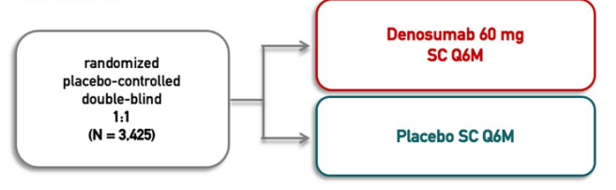 ABCSG-18试验是一项前瞻性、双盲、安慰剂对照的Ⅲ期试验(NCT00556374),纳入3425例绝经后早期HR+乳腺癌患者,这些患者于2006年~2013年在58家试验中心接受AI治疗,随机接受Denosumab (Dmab)60mg或安慰剂皮下注射,每6个月一次(q6m)。主要终点为首次临床骨折时间,次要疾病结局相关终点为无病生存期(DFS)、无骨转移生存期(BMFS)和总生存期(OS)。