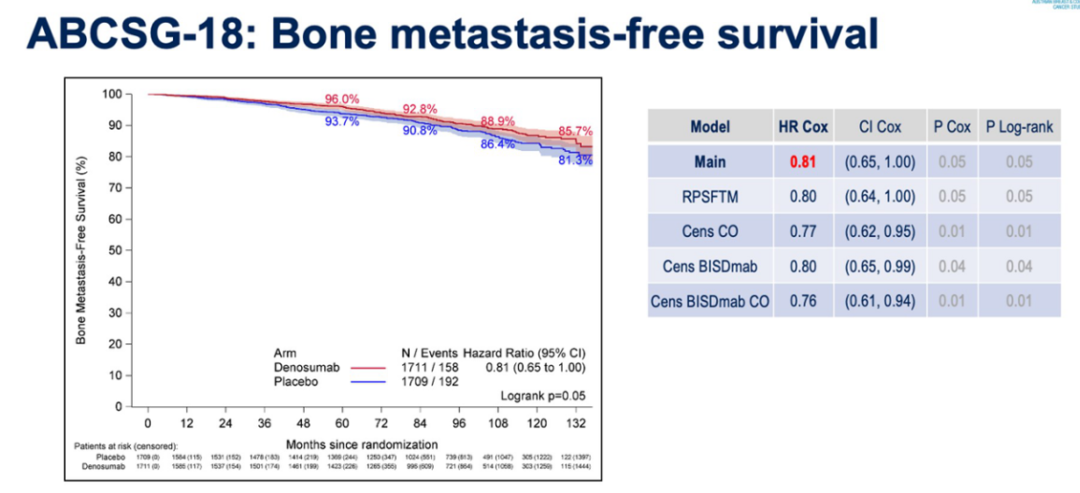 此次ASCO年会上报告了ABCSG-18试验的最终长期结果:中位随访时间为8年,中位治疗时间为5年。与安慰剂组相比,Dmab组改善了DFS[309例 vs. 368例DFS事件,风险比(HR)0.83,95%CI:0.71~0.97,P=0.016],9年DFS绝对差异为3.5%(79.4% vs. 75.9%)。当删失晚期交叉和使用抗吸收药物时,证实了DFS差异(HR 0.82,P=0.010)。