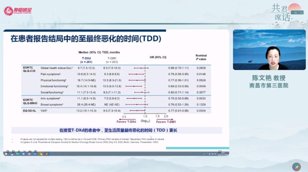 在抗肿瘤药物研发和肿瘤治疗过程中,患者报告的结局(PRO)也具有重要的参考价值。2022 ASCO年会就DESTINY-Breast03研究的PRO予以发布。该研究在第1、2、3周期、后续每2周期、治疗结束时(EOT)、治疗结束后40天、3个月分别请患者填写健康相关生活质量问卷(HR-QoL),包括肿瘤特异性量表(EORTC QLQ-C30)、乳腺肿瘤特异性量表(EORTC QLQ-BR45)、通用问卷调查(EQ-5D-5L)和住院记录评估。结果显示,T-DXd治疗期间EORTC QLQ-C30反馈总体健康状况(GHS)稳定;相较于T-DM1,T-DXd到生活质量恶化的时间(TDD)更长:T-DXd vs T-DM1 GHS TDD 9.7个月vs 8.3个月,情绪功能TDD 16.4个月vs 10.5个月,疼痛状况TDD 10.8个月vs 8.3个月,EQ-5D-5L自评健康状况TDD 13.2个月vs 8.5个月;首次住院事件时间T-DXd vs T-DM1为219.5天vs 60.0天。由此可见,T-DXd较T-DM1有更好的疗效改善和可管理的安全性。