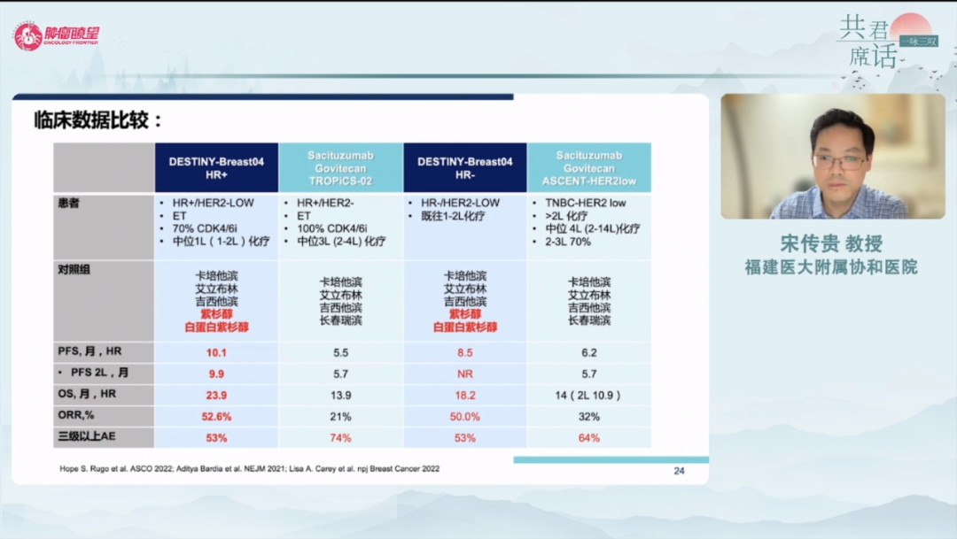 宋传贵教授(福建医科大学附属协和医院):我中心参与了DESTINY-Breast05研究,从目前的使用经验来看,并未发现明显的毒副作用,尤其是间质性肺病。结合DESTINY-Breast03、04两项研究来看,在DESTINY-Breast03研究中一线使用T-DXd并无严重的间质性肺病,而在DESTINY-Breast04研究中二线使用T-DXd有少量间质性肺病的报道,由此可见患者接受更多的前序治疗可能会为带来更高的毒副作用风险。希望临床中能过通过多学科诊疗尽早发现患者不良反应的端倪,积累更多经验,为患者带来更多获益。