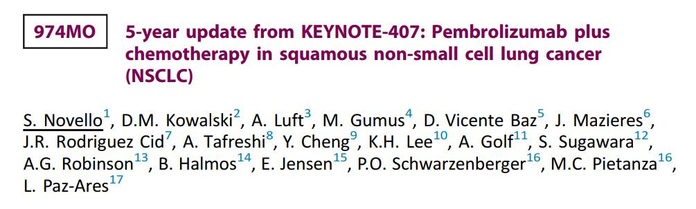 研究结论:经过5年随访,Pembrolizumab联合化疗相较于单纯化疗,可以改善初治鳞癌患者PFS及OS。研究数据支持Pembrolizumab联合化疗作为鳞癌患者的一线标准治疗选择。