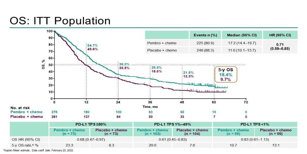 研究结果:两组分别有278例和281例患者,随访至2022年2月,全组中位随访时间为56.9个月,51.1%的化疗组患者疾病进展后交叉接受免疫治疗。ITT人群的中位OS分别为17.2个月和11.6个月,HR=0.71,5年OS率分别为18.4%和9.7%,3度及以上不良反应发生率分别为74.8%和70.0%。在55例完成35周期Pembrolizumab治疗的患者中,ORR为90.9%,完成35周期Pembrolizumab治疗后的患者,3年OS率为69.5%。