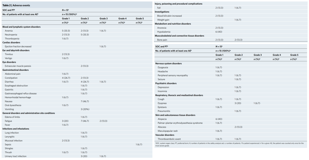5例(33.3%)患者发生一次减剂量,4例(26.7%)发生两次减剂量,减剂量原因包括疲劳(4例)、腹泻(3例)、中性粒细胞减少(1例)和患者要求(1例)。3例患者发生剂量延迟(中性粒细胞减少、左室收缩功能障碍和尿路感染各1名)。4例患者共记录6次严重不良事件(SAE),包括心脏射血分数下降、肺部感染、尿路感染、脓毒血症、疼痛、癫痫各1例。特别关注的不良事件中,每例患者均观察到2级间质性肺疾病(ILD)和有症状的左室射血分数下降。