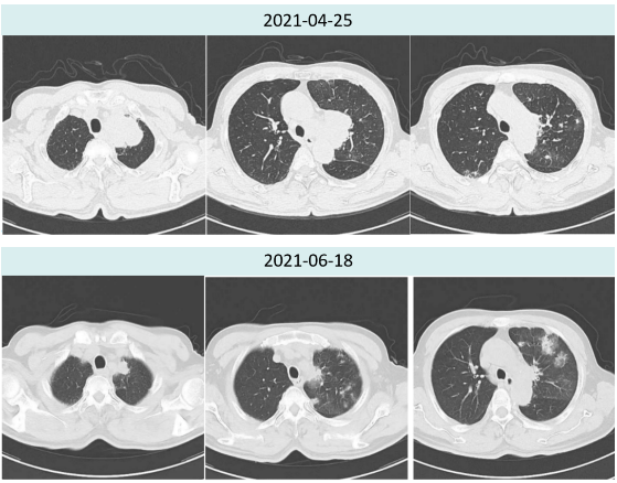 2021年6月18日治疗两周期后复查胸部CT提示:肿瘤较前明显缩小(4.5cm→2.0cm),新增多发炎性病灶,总体疗效评价为PR。