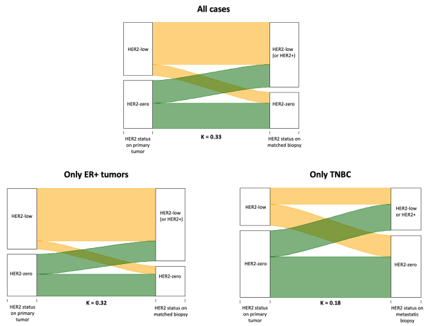 图1.早期和晚期乳腺癌之间HER2低表达的演变[该图形象地显示了匹配的早期乳腺癌和晚期活检的HER2状态演变。在所有病例(总体人群、ER阳性肿瘤和TNBC)中,观察到早期样本和晚期样本之间存在显著不一致,后者HER2表达病例增加]