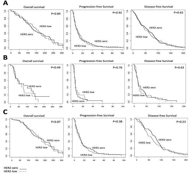 图2.根据HER2低表达状态的疾病预后(比较了HER2低表达和HER2 0患者人群的疾病结局,并对总体人群(A)、TNBC(B)和ER阳性肿瘤(C)进行了单独分析。与HER2 0肿瘤相比,HER2低表达肿瘤的总生存期、一线治疗的无进展生存期和无病生存期无统计学显著差异)