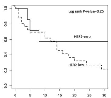 图3.一线内分泌治疗联合CDK4/6抑制剂的无进展生存期[在接受内分泌治疗联合CDK4/6抑制剂作为晚期疾病一线治疗的HER2低表达和HER2 0患者人群中,比较一线治疗后的无进展生存期(PFS1)(n=33)。在两类人群中未观察到PFS1差异(p=0.25)。HER2低表达肿瘤的中位PFS1为14个月(95%CI 5-24),HER2 0肿瘤未达到中位PFS1]