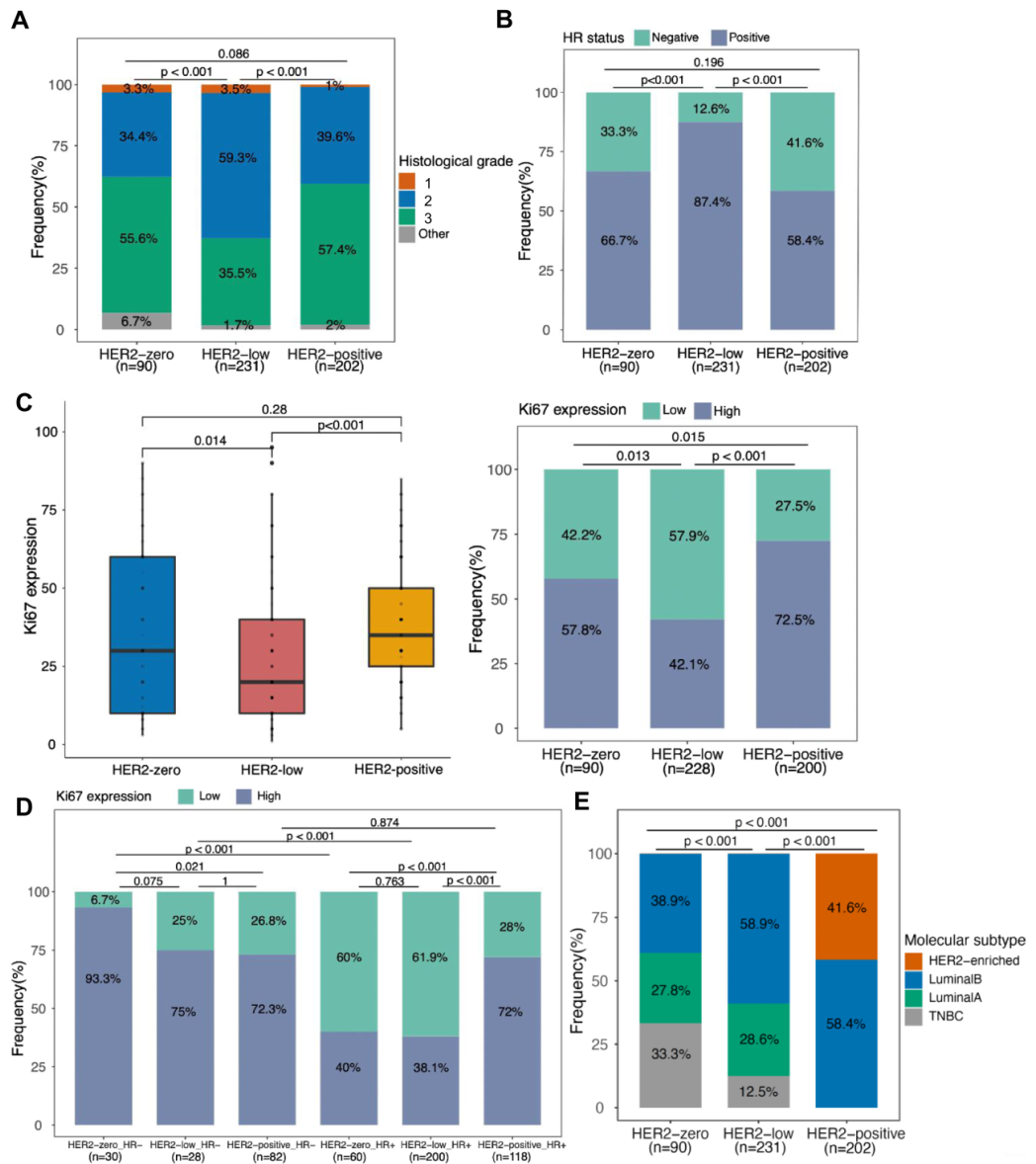 图2.各HER2亚组具有不同的临床特征,包括组织学分级(A)、HR状态(B)、Ki67表达水平(C/D)、基于IHC的分子亚型分布(E)