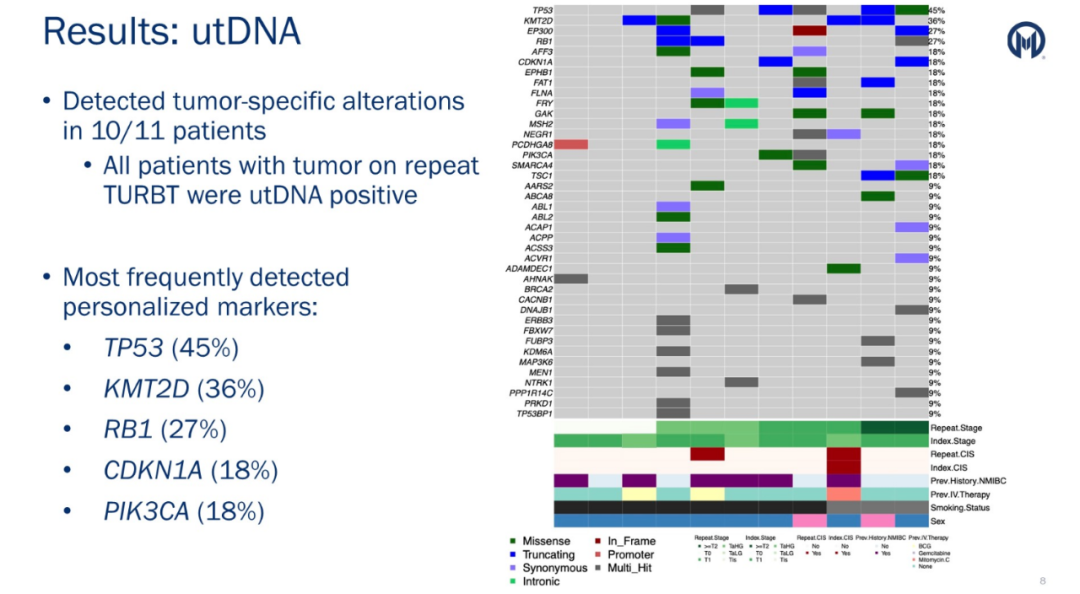 该研究纳入了11例高危NMIBC患者。对指标肿瘤(Index tumor)和rTURBT肿瘤组织进行全外显子测序(WES)。在rTURBT前采集尿液进行utDNA检测,utDNA检测是通过尿cfDNA的超深度测序进行的,使用每个患者最多50个基线突变的定制面板,以及通过PredicineBEACON覆盖热点区域和可操作变体的固定核心面板。主要终点是检测utDNA以预测二次电切时的MRD。