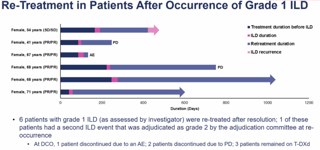 在DESTINY-Breast04研究中,大多数间质性肺炎患者痊愈,不过有6例患者在1期间质性肺炎缓解后需要再进行治疗,这是一个令人意外的结果。在这6例患者中,3例接受了持续18个月(中位随访期)的治疗且没有复发。1例患者因发展为2期间质性肺炎放弃治疗,另外2例患者因疾病进展而放弃治疗。因此,我认为我们亟需更多关于获得间质性肺炎缓解后仍需再治疗的患者数据,同时,使用激素类药物有助于缩短首次观察到间质性肺炎至影像学标准下疾病恢复的时间。