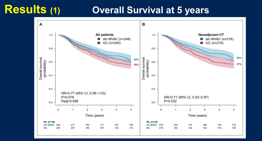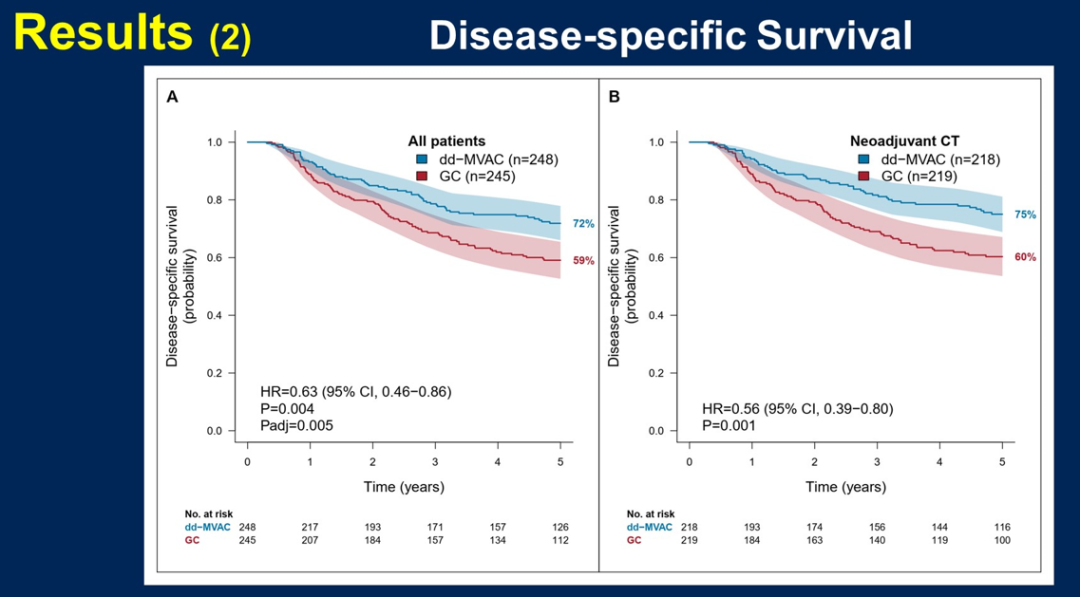 437例(88%)患者接受了新辅助化疗,60%的患者接受了计划6个疗程的dd-MVAC治疗,84%的患者接受了4个疗程的GC治疗,之后分别有91%和90%的患者接受了手术。最终中位随访时间为5年3个月,随访5年内报告了190例死亡。结果显示,dd-MVAC组改善了5年OS(64%vs 56%,HR=0.77[95%CI,0.58-1.03],P=0.078)和疾病特异性生存率(DSS)(5年生存率:72%vs 59%,HR=0.63[95%CI,0.46-0.86],P=0.004)。