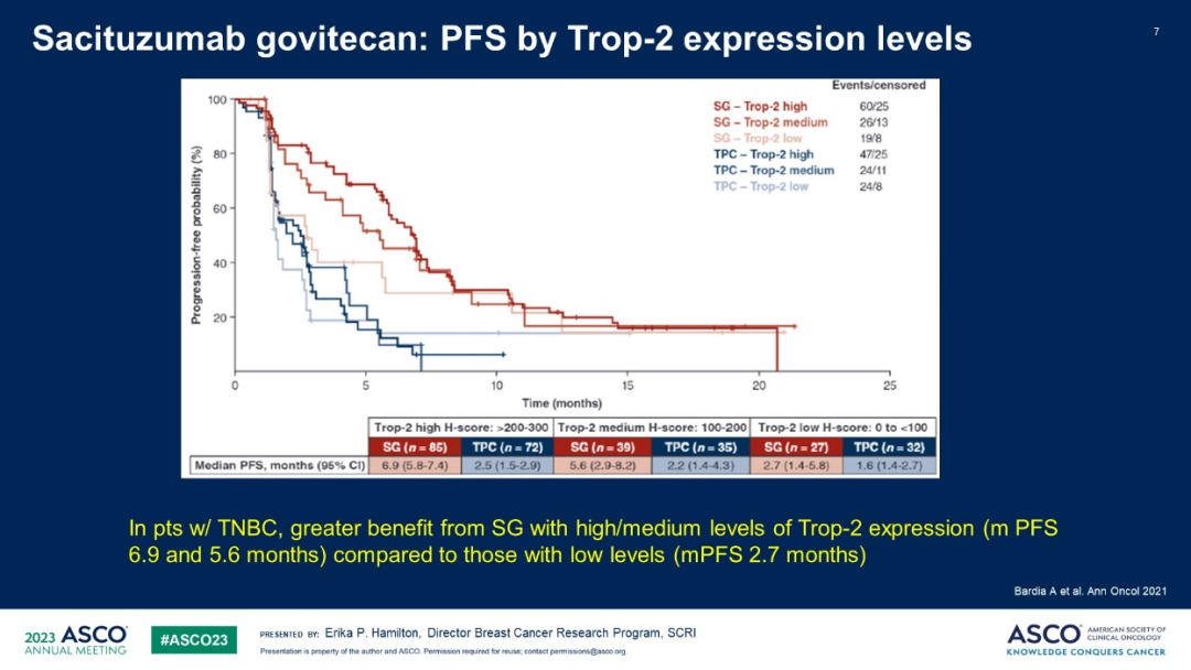 与之类似的,在三阴性乳腺癌(TNBC)中,随着Trop-2表达水平降低,戈沙妥珠单抗(SG)也呈现出了无进展生存期(PFS)越差的趋势,Trop-2高表达vs中表达vs低表达的mPFS分别为6.9个月vs 5.6个月vs 2.7个月。