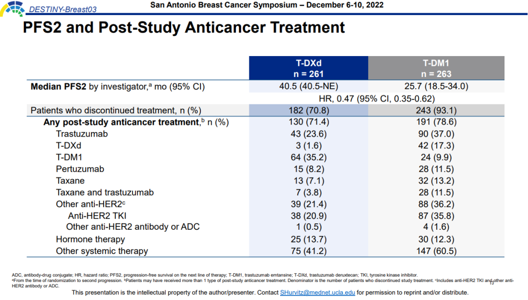 [3]Hurvitz SA,Hegg R,Chung WP,et al.Trastuzumab deruxtecan versus trastuzumab emtansine in patients with HER2-positive metastatic breast cancer:updated survival results of the randomized,phase 3 study DESTINY-Breast03.Abstract presented at:2022 San Antonio Breast Cancer Symposium;December 6-10,2022;San Antonio,TX.Abstract GS2-02.