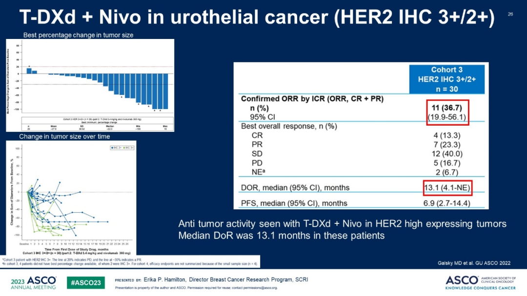 在尿路上皮癌领域,T-DXd联合纳武利尤单抗取得了36.7%的ORR,mDoR达到13,1个月;EV联合帕博利珠单抗一线治疗取得了73.3%的ORR,mDoR为25.6个月,同样取得了不俗的成绩。