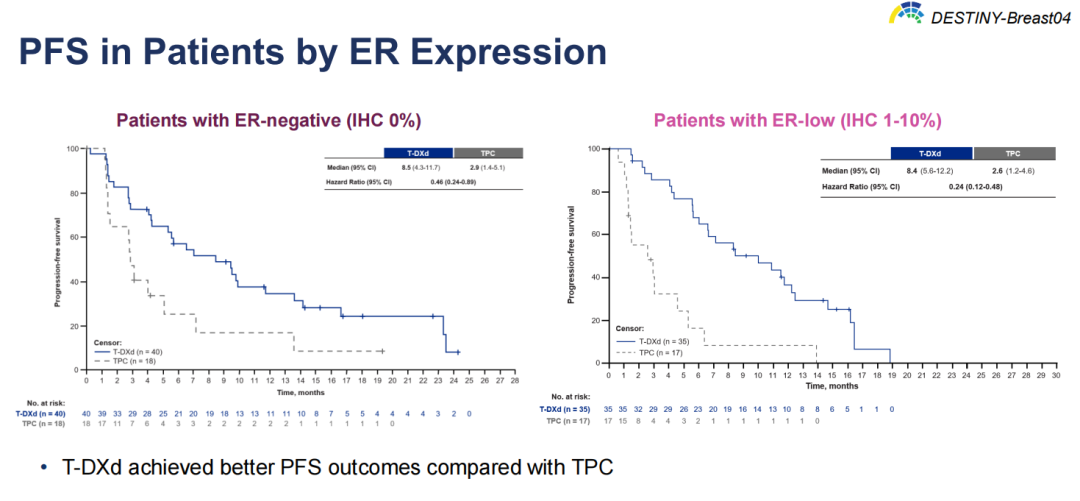 DB-04在HR+人群中PFS和OS均获得显著改善,但ER的表达量是否影响其获益?尤其是ER低表达(1-10%)人群,近年来被临床关注到的一组乳腺癌病理类型,总体上认为其生物学特征与ER阴性相似,其中ER低表达、HER2低表达(IHC 1+或IHC 2+且ISH-)乳腺癌的特征则与三阴性乳腺癌(TNBC)相似[11-12]。那么,在HR+/HER2低表达患者中,ER表达水平是否会影响T-DXd的治疗获益?