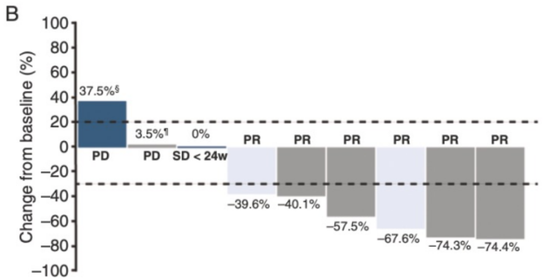 Ⅱ期DAISY研究则显示(下图),即使在HER2零表达晚期乳腺癌中,T-DXd仍有积极的抗肿瘤活性[14]。这些数据表明,对于可能存在HER2时空异质性的乳腺癌,T-DXd治疗都将有效发挥作用,因其在不同HER2表达水平患者中均显示抗肿瘤活性。