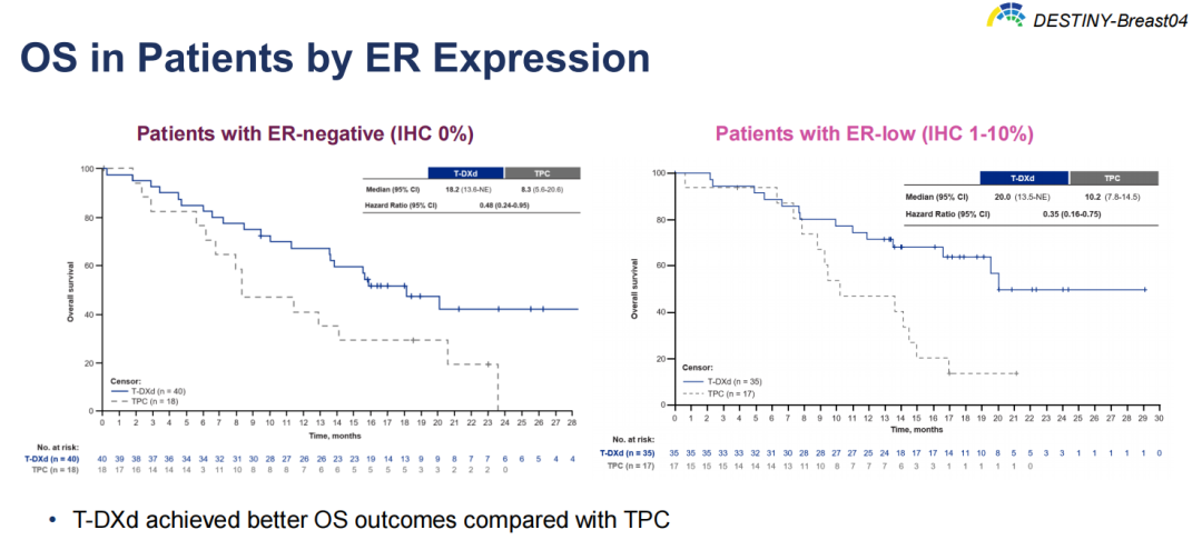 2023年EMSO BC报道了一项针对DB-04研究HR+人群中ER低表达患者的探索性分析,结果同样显示T-DXd治疗带来的PFS(8.4 vs.2.6个月,HR 0.24)和OS(20.0 vs.10.2个月,HR 0.35)改善[13]。而之前DB-04研究的首次中期分析中,T-DXd在HR-患者已显示有PFS(8.5 vs.2.9个月,HR 0.46)和OS(18.2 vs.8.3个月,HR 0.48)的一致获益。