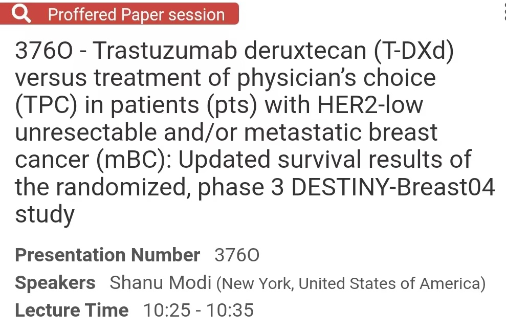 [8]Shanu Modi,et al.Trastuzumab deruxtecan(T-DXd)vs treatment of physician’s choice(TPC)in patients(pts)with HER2-low,hormone receptor-positive(HR+)unresectable and/or metastatic breast cancer(mBC):Exploratory biomarker analysis of DESTINY-Breast04.J Clin Oncol 41,2023(suppl 16;abstr 1020)