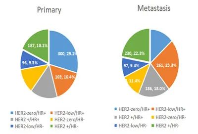 背景:HER2低表达对乳腺癌预后的影响目前仍在探索中。同时,在HER2阴性(包括HER2 0和HER2低表达)晚期乳腺癌患者中,原发肿瘤和转移灶的HER2水平是否存在差异性表达,以及这种差异是否影响患者预后,目前尚不确定。