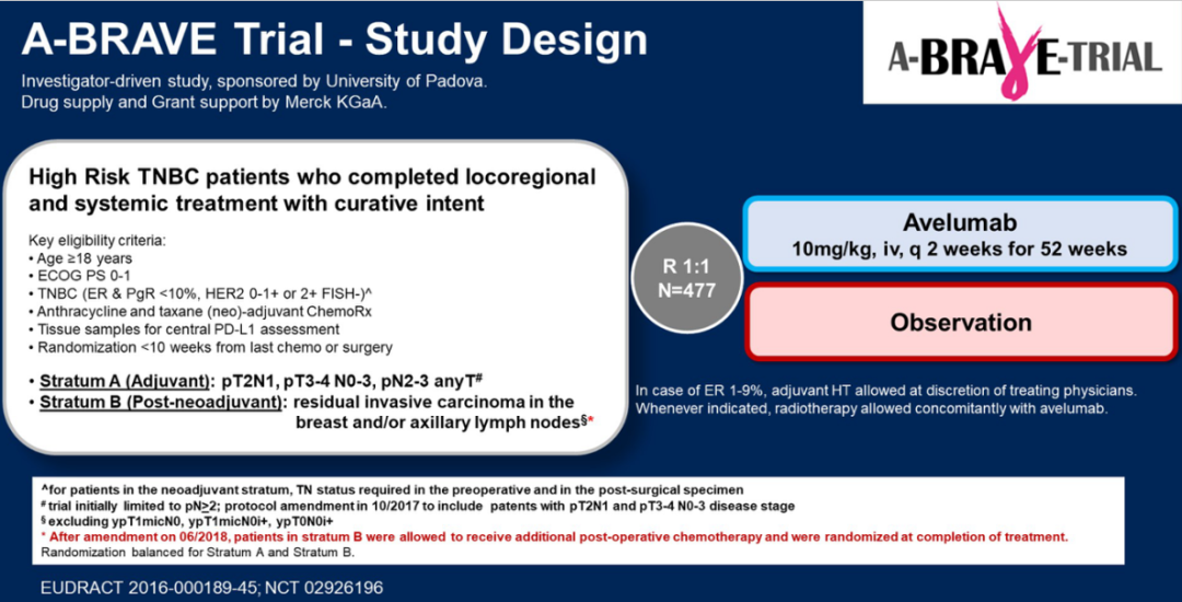A-BRAVE是一项Ⅲ期、多中心、随机临床试验,比较了为期1年阿维鲁单抗治疗和观察治疗在早期高复发风险TNBC中的疗效。患者在完成包括手术和新辅助/辅助化疗在内的标准治疗后入组。高风险定义为:1、初次手术后>pN2/任何pT、pN1/pT2或pN0/pT3(A层),2、新辅助化疗后残留浸润性病灶(乳房和/或淋巴结)(B层)。
