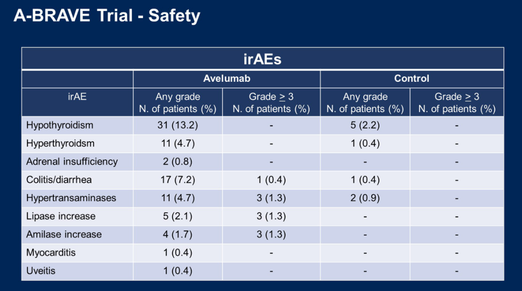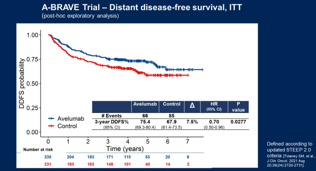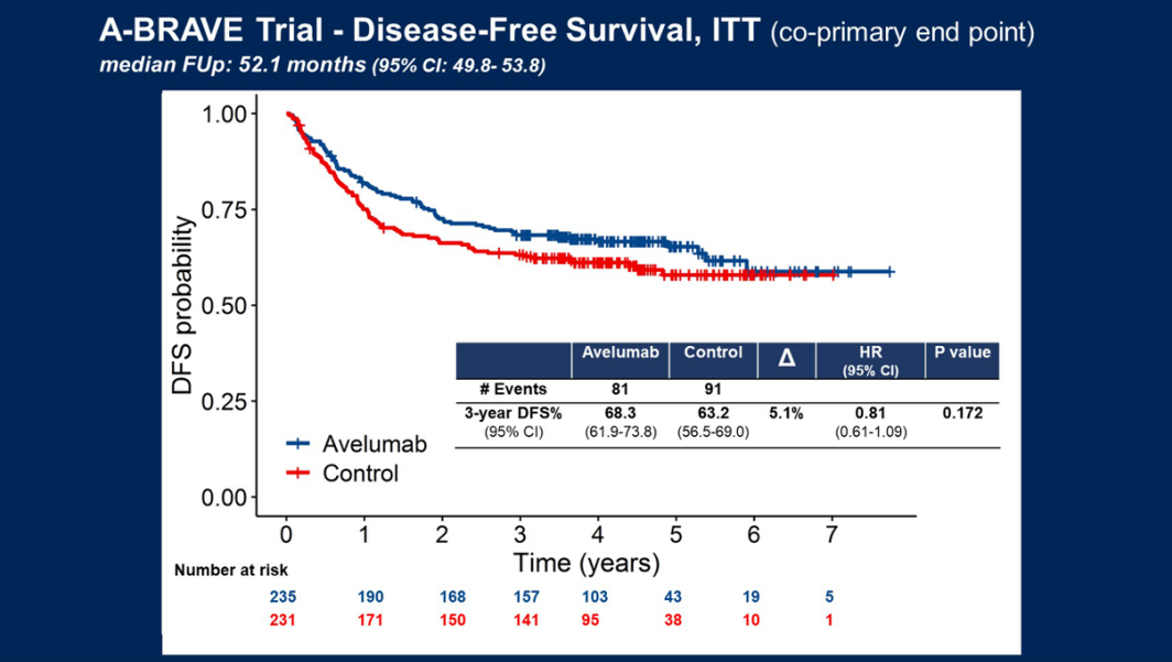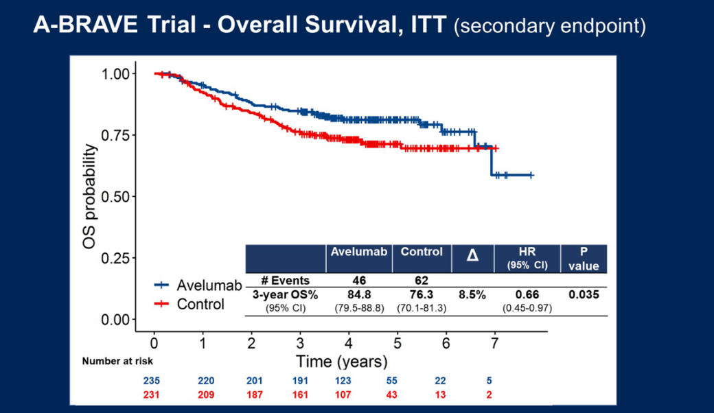 ITT人群中,阿维鲁单抗组在总生存上有获益,3y-OS率为84.8%vs 76.3%,P=0.035。同样的,阿维鲁单抗组在无远处转移生存期(DDFS)也有获益,3y-DDFS率为75.4%vs 67.9%,P=0.0277。此外,阿维鲁单抗的耐受性良好,大多数患者能够完成治疗。