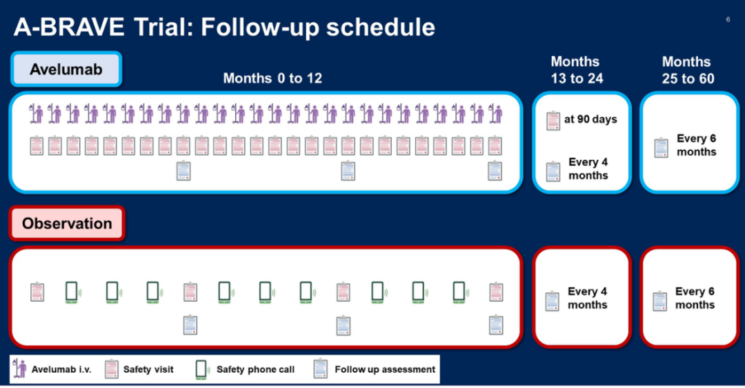 将患者随机分配(1∶1,A层和B层平衡)至阿维鲁单抗组(10mg/kg IV,q2w,治疗1年)或观察组。共同主要终点是总人群和B层的无病生存期(DFS)。在总人群中,需要474例患者来检测3年DFS率从60%提高到73.6%(HR=0.6;90%把握度,单侧检验,α2%)。需要172个DFS事件来进行事件驱动分析。假设70-80%的患者进入B层,则该亚组的α水平检测到HR=0.6的预期把握度为70-79%。次要终点是总生存期(OS)。