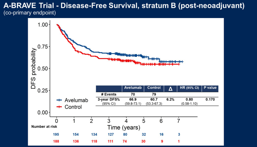 与对照组相比,为期一年的阿维鲁单抗辅助治疗并不能显著改善高危TNBC患者的DFS。然而,与对照组相比,阿维鲁单抗显著改善了次要终点OS。此外,远处转移风险降低了30%,死亡风险降低了34%。该研究还将报告RFS和DMFS。已对肿瘤组织、血浆和粪便进行了集中收集,并将进行一系列相关研究。