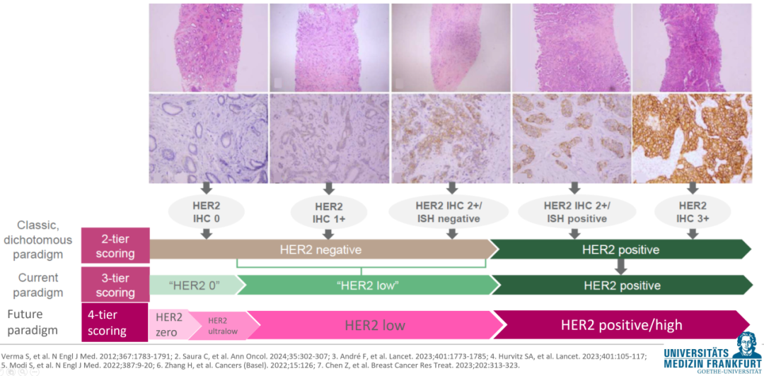 根据ESMO和ASCO/CAP指南,TNBC被定义为雌激素受体(ER)和孕激素受体(PR)表达均低于1%,且HER2阴性的乳腺癌亚型[1,2]。近年来,HER2状态的分类已从传统的“阳性/阴性”二元模式,细化为零表达、超低表达、低表达和高表达(阳性)。值得注意的是,HER2低表达与ER状态密切相关,在TNBC中约占40%,而在ER高表达(>95%)的乳腺癌中比例更高,约达62%[3]