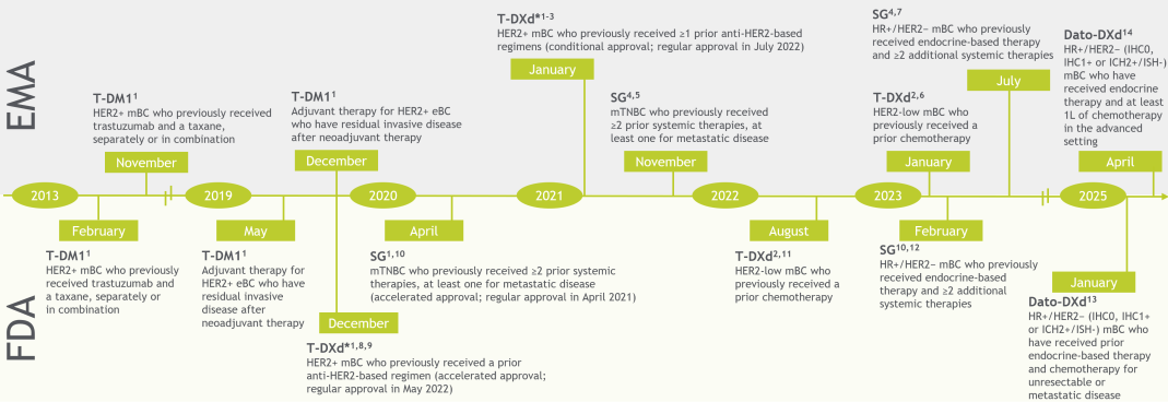 ADC通过抗体、连接子和细胞毒性载荷的精准组合,兼具靶向性与细胞毒作用,已成为乳腺癌治疗的重要创新策略。目前,欧洲药品管理局(EMA)和美国食品药品管理局(FDA)已批准多款ADC用于乳腺癌治疗,包括针对HER2的恩美曲妥珠单抗(T-DM1)、德曲妥珠单抗(T-DXd),以及针对Trop-2的戈沙妥珠单抗(SG)和德达博妥单抗(Dato-DXd)。其中,Trop-2靶向ADC率先在TNBC中展现出临床获益,正在重塑该领域的治疗格局,为患者提供新的治疗选择。
